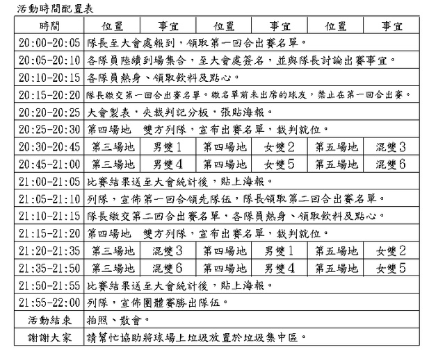 <!-- Origin Article URL: http://www.wretch.cc/blog/feph101/11791269 --> 簡單的友誼賽時間配置表我已經上傳到相簿<br>這只是一個簡表<br>畢竟當天活動一定會有人遲到或是有賽事打得不分軒輊<br>不過大家可以先幫忙看一下有什麼要補充的<br>請告訴我一聲<br>感恩~<br><br>慧雯<br><br><span><a href="http://www.wretch.cc/album/show.php?i=feph101&b=2&f=1899163018.jpg" target="_blank"><img border="0" src="http://pic.pimg.tw/feph101/1378568387-2588016692.jpg"></a></span>